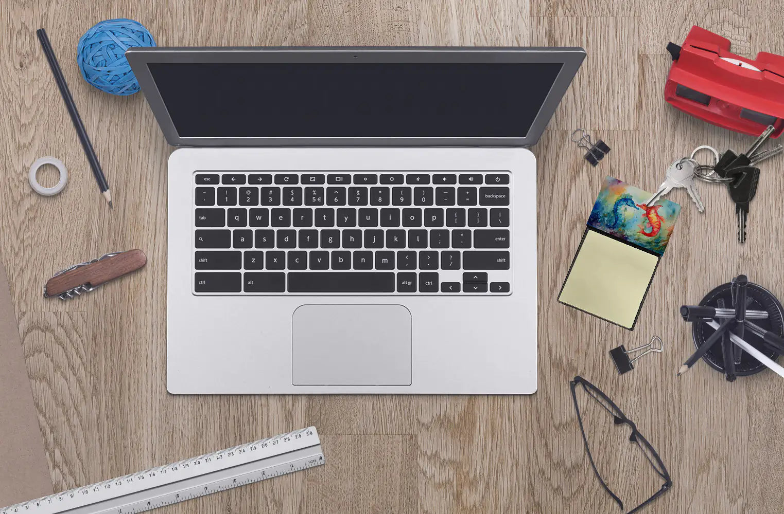 Sticky Note Holder featuring breed specific Seahorses artwork. Add a touch of creativity and flair to your desk with the Decorative Sticky Note Holder from Caroline's Treasures. This uniquely designed sticky note dispenser will not only keep your notes in one place but also add an artistic element to your workspace. The top of the holder features beautiful artwork that is sure to catch the eye. Crafted for convenience, this sticky note holder comes with a small pad of 3-inch x 3-inch sticky notes at the bottom. The holder is designed for easy refilling; simply remove the last sheet of a new sticky note pad and stick it onto the board. This feature ensures you will always have sticky notes at your disposal. This Sticky Note Holder makes a perfect gift. Be it for your colleagues at work, your Facebook friends, or even your dog groomer or hairdresser, this versatile product fits the bill. You can use it for making grocery lists, leaving notes for loved ones, or for jotting down important reminders. The bottom board is rigid and can be magnetized by adding a business card size magnet to the back (sold separately). This makes it even more versatile, allowing you to place it on a refrigerator or any other magnetic surface. With this Sticky Note Holder, you're not only organizing your notes, but also personalizing your space.
